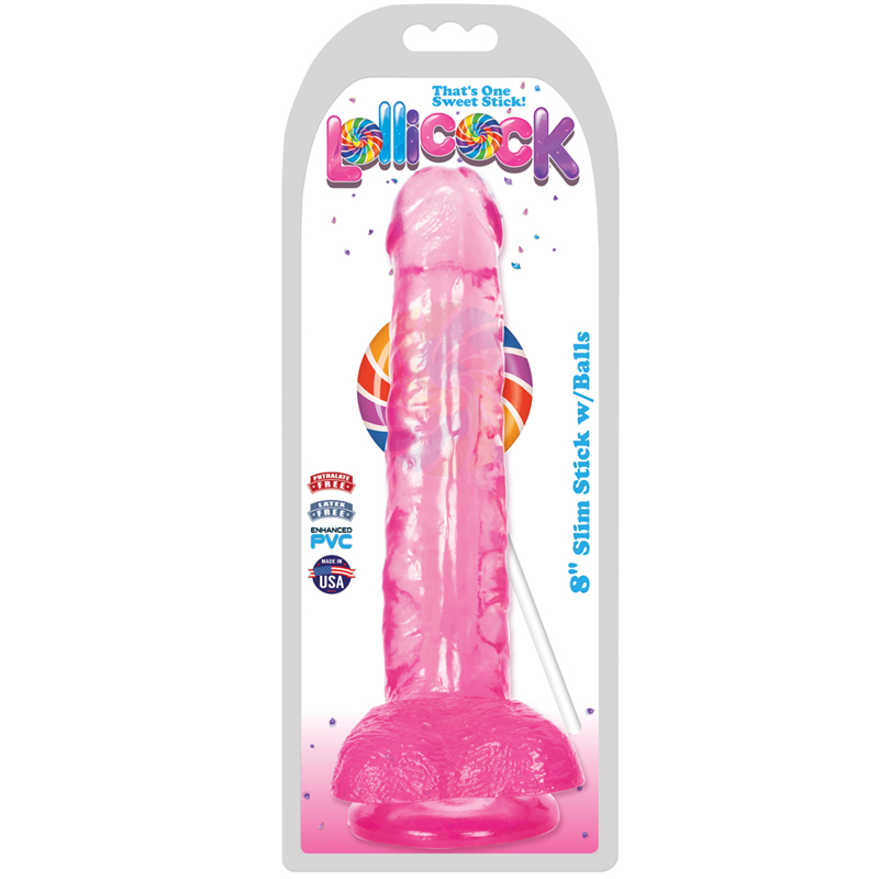 Curve Toys Lollicock Slim Stick 8 in. Dildo with Balls & Suction Cup Cherry Ice