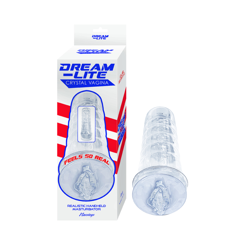 Want a front-row view to your pleasure? The Dream Lite Crystal Vagina Realistic Handheld Masturbator is sleek clear and lined with pleasure rings and nubs for the ultimate sexual experience. Enjoy watching your member slide in and out through the crystal-clear material for the ultimate in voyeuristic sessions. Get ready to take control of your fantasy with the Dream Lite Crystal Vagina Realistic Handheld Masturbator. It’s sleek compact ergonomically designed and discrete. Which also makes it ideal for travel and storage. The Dream Lite Crystal Vagina Realistic Handheld Masturbator material is elastic and soft. So it can easily maintain shape and warm naturally with touch and friction. Want to play with temperature even more? soak the sleeve in warm water before use or warm up your favorite Water-Based Lubricant while you’re at it. To clean your Dream Lite Crystal Vagina Realistic Handheld Masturbator and have it ready for the next session rinse thoroughly with warm water and avoid using any soap. Most importantly let the insert dry completely before storing it away so leave it out until then. With regular use the sleeve might get a bit sticky if this happens just sprinkle it liberally with cornstarch or FleshLight Renewing Powder to restore softness and if you plan to store it also coat it with the powder. Store this toy separately from other sex toys for longevity.