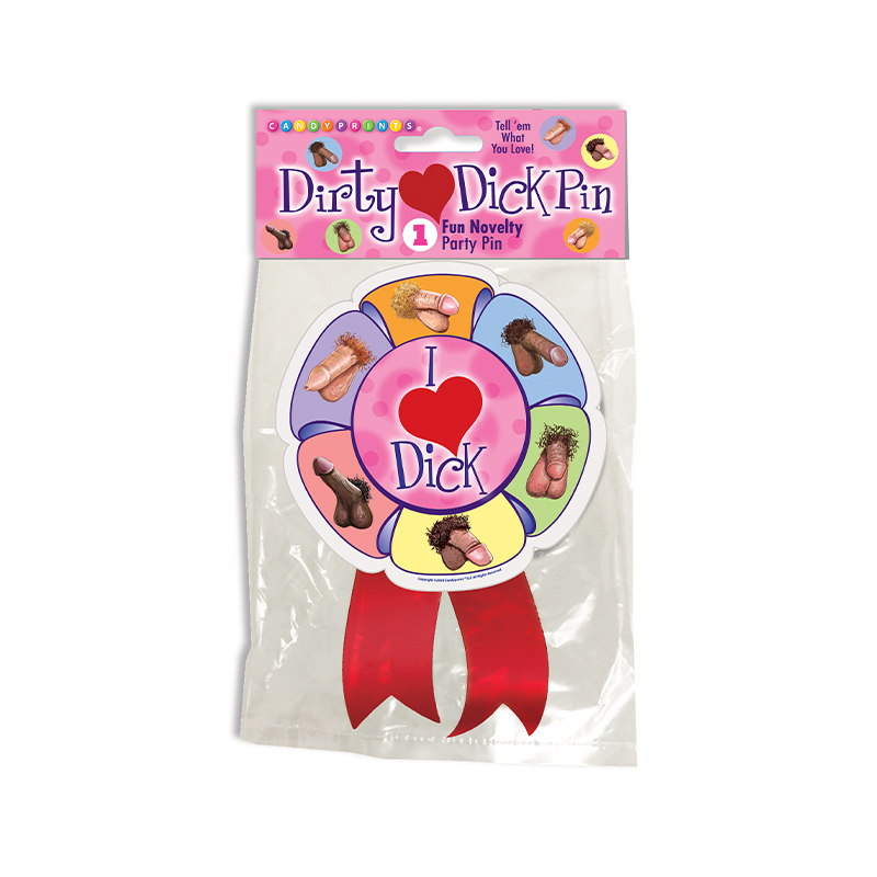 This pin is designed for discerning party enthusiasts that seek unique high-quality embellishments at affordable prices. The I Love Dick Party Pin celebrates dicks of all shapes sizes and colors. Each 4×5 inch pin features a self-adhesive sticker that will not harm or snag fine fabrics or apparels. Complete the look or theme with coordinating Dirty Dick plates napkins balloons and candles. If you have a reputation for outstanding style and taste make a statement at your next outing with the I Love Dick party embellishment pin.