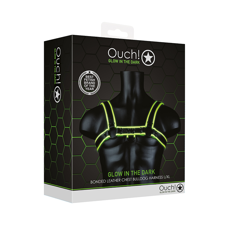 Ouch! Glow in the Dark Bonded Leather Chest Bulldog Harness Neon Green L/XL