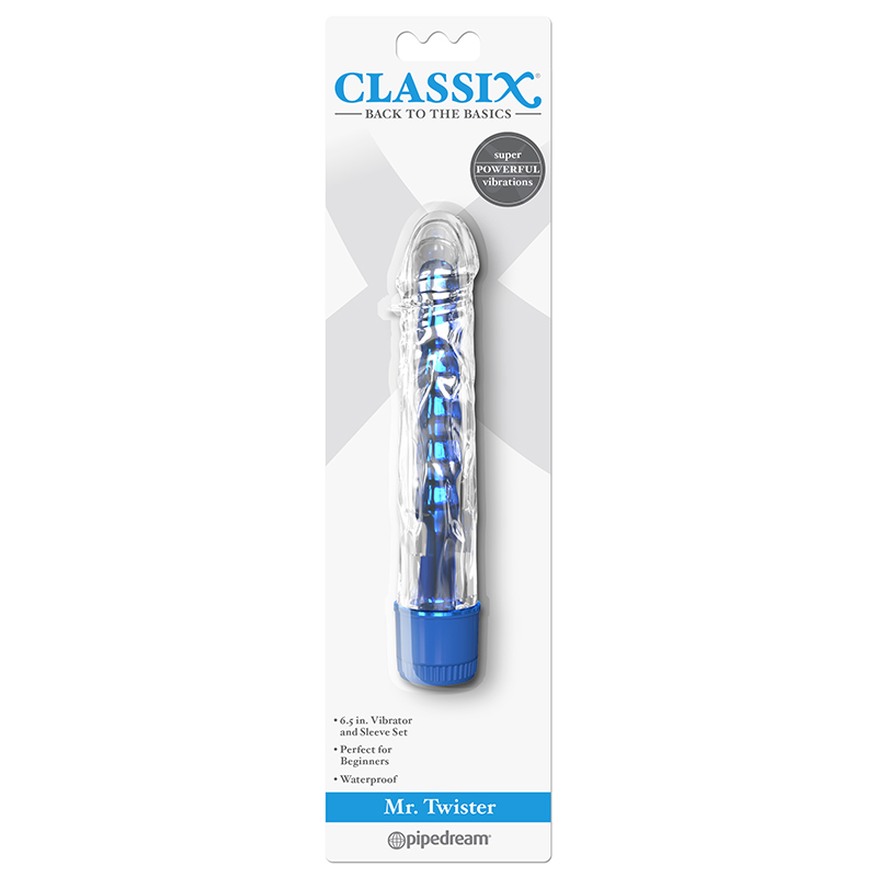 With his crystal clear sleeve and shiny metallic insides Mr. Twister is the right man for the job! Turn the dial on the multi-speed base and let the powerful vibrations whisk you away! The soft body-safe sleeve has a veiny swirl texture lifelike head and tiny ticklers for extra stimulation. Best of all the removable sleeve can be used as a penis extension and the beaded vibe can be used alone for vaginal or anal play.Cleanup is a snap after the fun with toy cleaner and warm water.Waterproof 6.5 in. Vibrator and Sleeve Set Perfect for Beginners.Available in Purple and Blue colors.