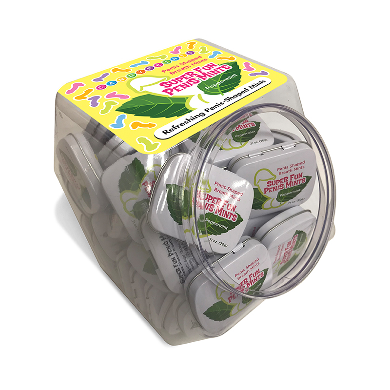 Super Fun Penis Mints POP display contains 48 individual tins of Super Fun Penis Mints in a stylish fishbowl display. These delicious and hilarious mints make great impulse sales at the register.