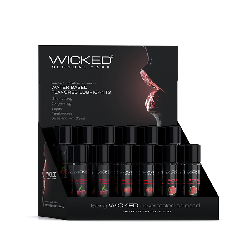 Wicked Sensual Care’s flavored lubes are water-based completely lickable and come in many tantalizing flavors. This display contains eight 1 oz. bottles each in the following: Cherry Watermelon and Strawberry.